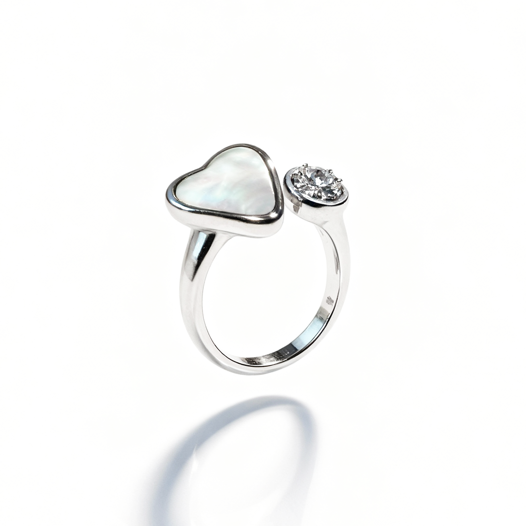 O Anel Afeto é a celebração do sentimento no quotidiano. Com o seu design de anel aberto em prateado, esta joia exibe um coração em madrepérola e um cluster cravejado. A combinação dos materiais confere-lhe um luxo suave e um toque de romance discreto, ideal para aquecer os tons da estação de Outono.