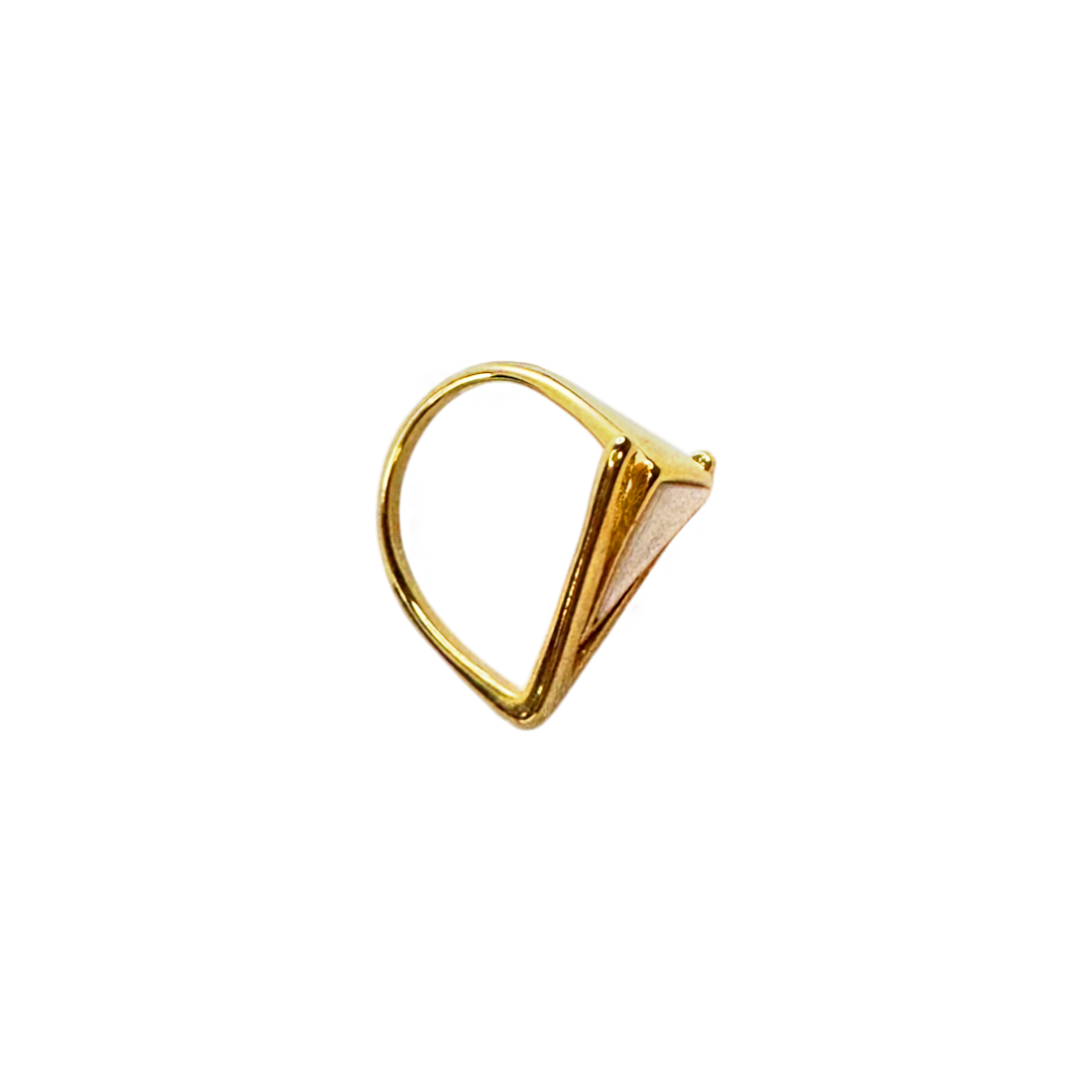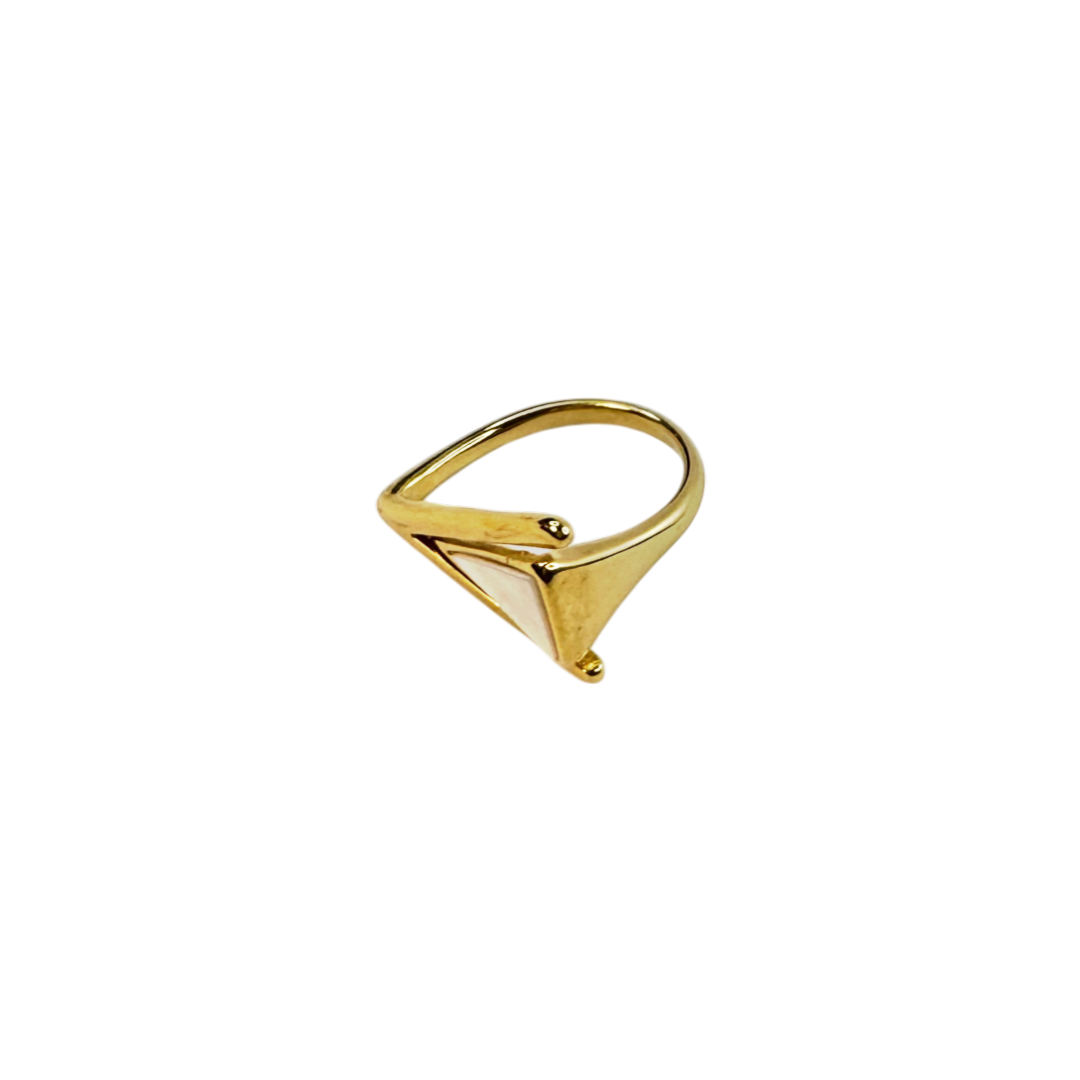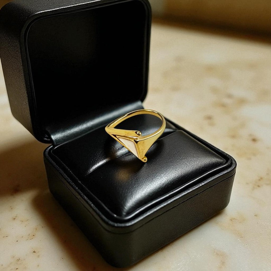 Com linhas limpas e design geométrico, esta peça celebra a elegância da simplicidade com atitude. A forma triangular, marcada por um contraste subtil entre o branco e o dourado, transmite força e clareza — como os primeiros raios de sol ao amanhecer. Ideal para quem valoriza autenticidade, estrutura e estilo com significado.