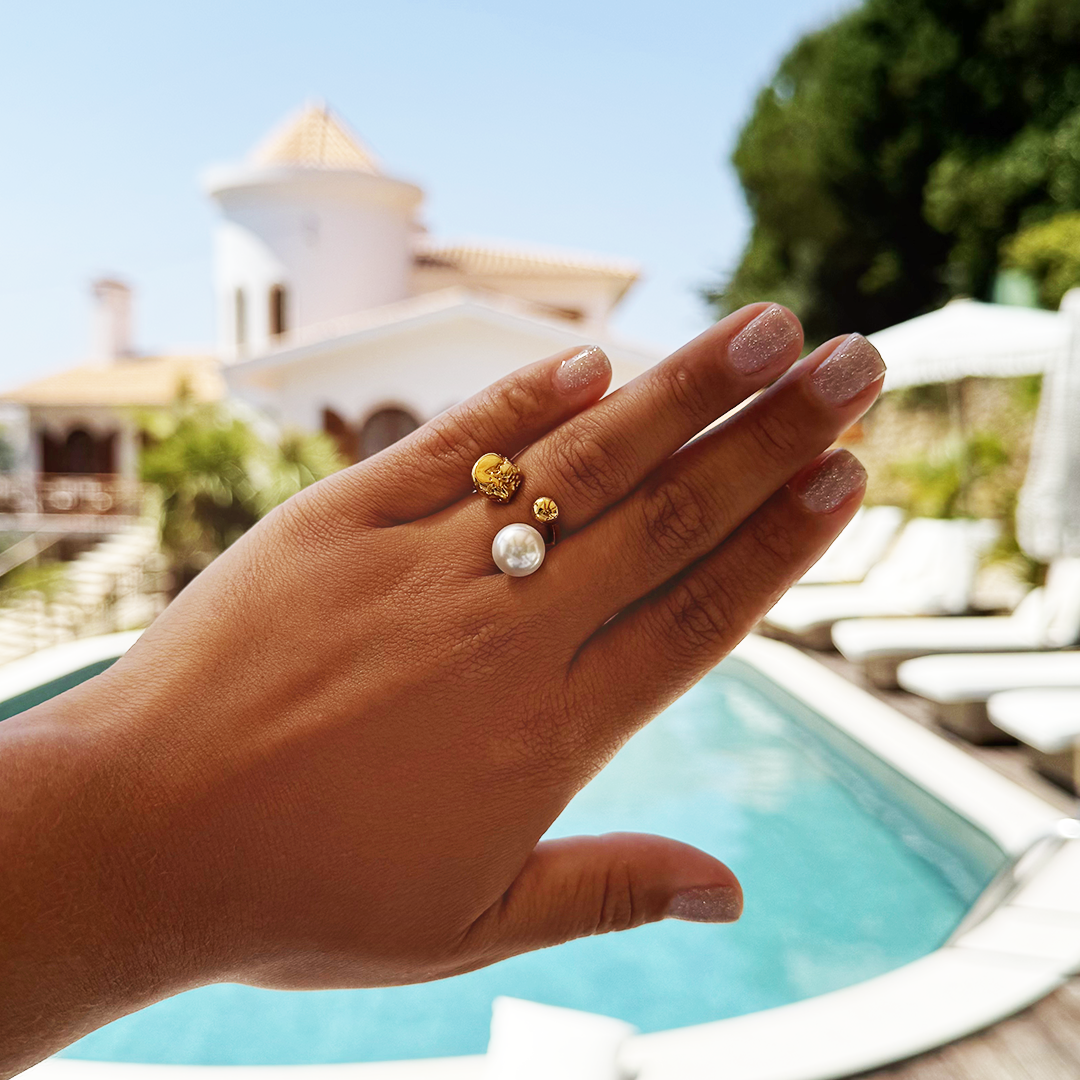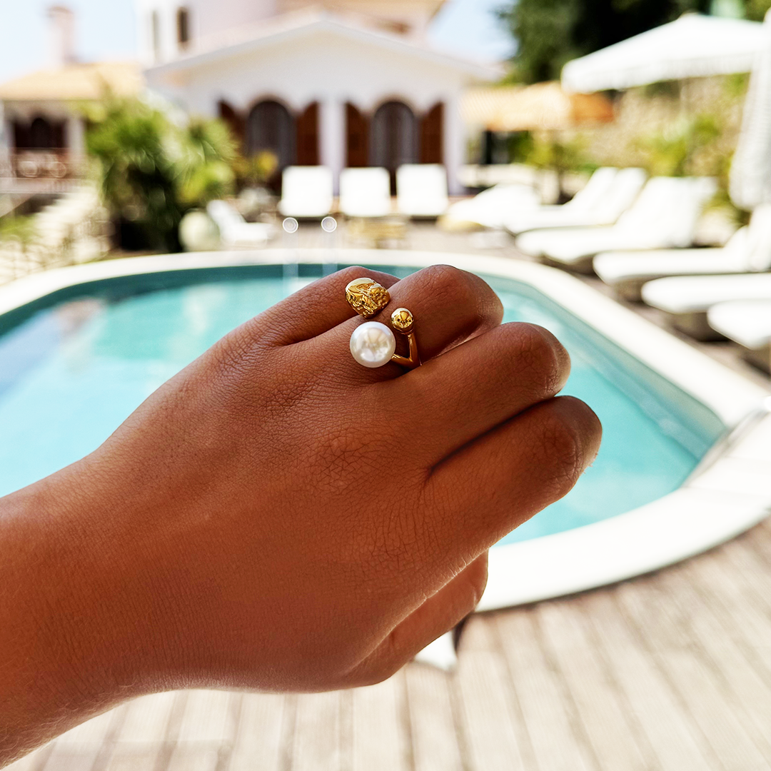 Elegância simbólica e brilho atemporal. O Anel Elpis combina a delicadeza da pérola com a força mística do detalhe em serpente, numa peça que representa esperança, renascimento e feminilidade elevada. Um acessório com design ousado e refinado, ideal para mulheres que transformam presença em poder. Ajustável para diferentes tamanhos.