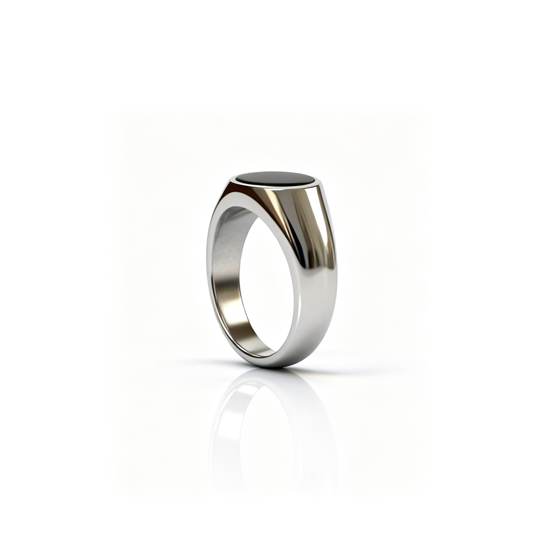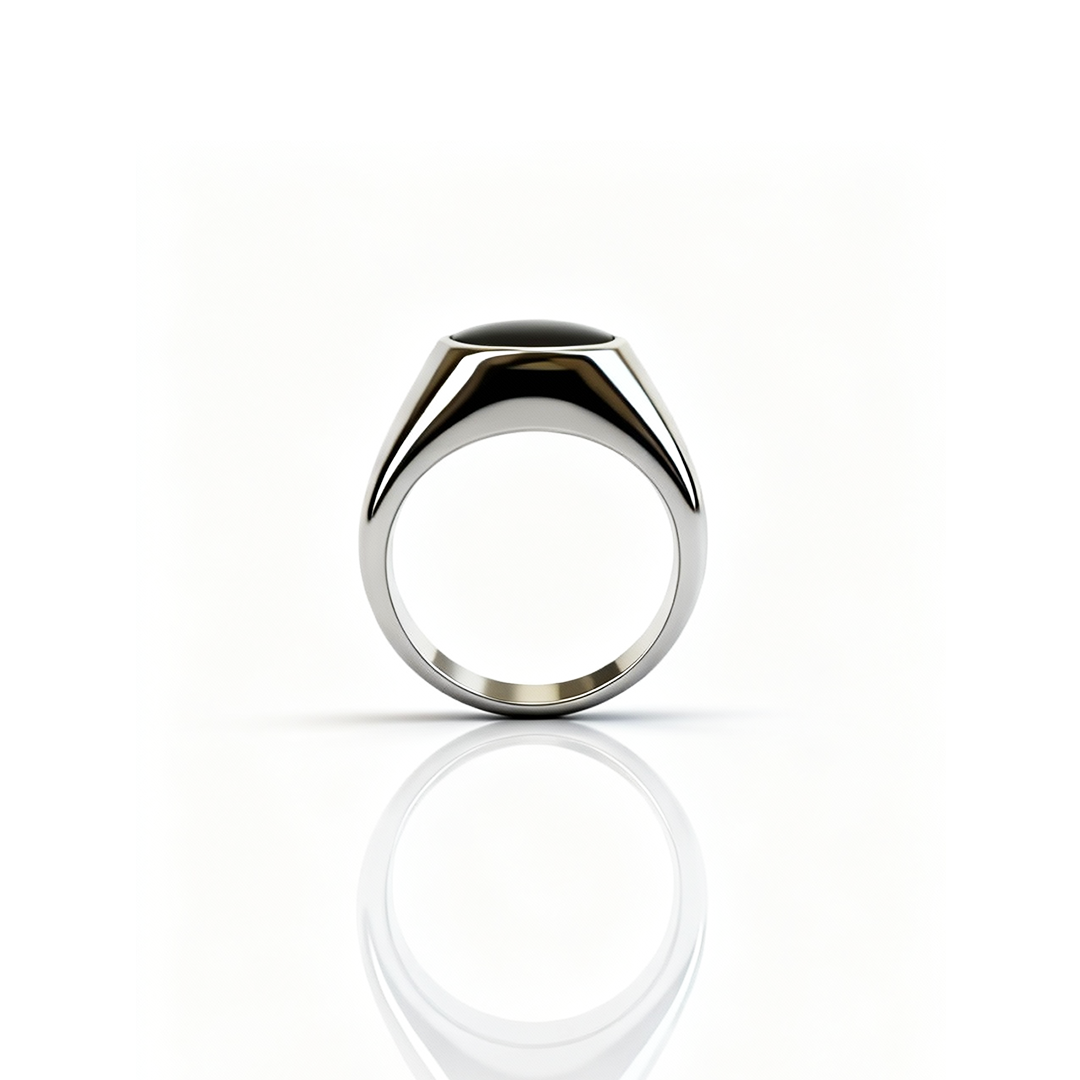 O Anel Essencial é a definição da sofisticação despretensiosa. No universo masculino, o prateado representa a versatilidade e a modernidade. Seu design clássico de sinete, com a incrustação preta oval, é elegante e minimalista. É a joia fundamental para o homem que busca um toque de presença sóbria e atemporal, sem abrir mão da naturalidade.