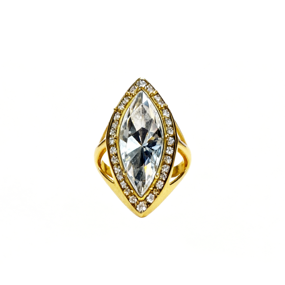 O Anel Luxor é uma peça de luxo inegável e impacto monumental. Com a sua zircónia central de grande formato navette e o seu halo de cravejados em dourado, esta joia irradia um brilho que evoca o esplendor da realeza antiga. O seu design clássico, mas imponente, torna-o um ponto focal de opulência para o seu Outono.