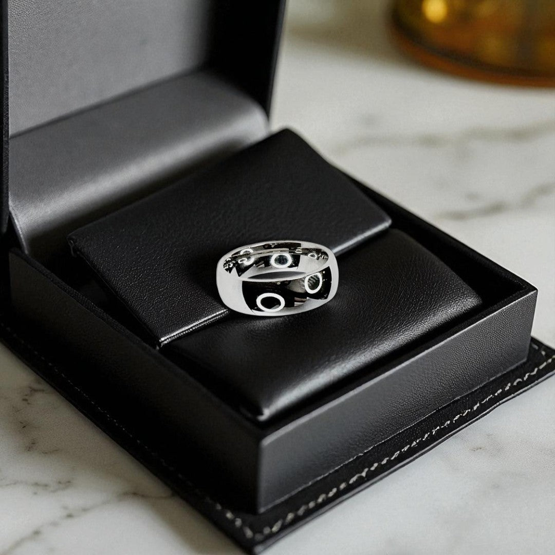 Com design ousado e minimalista, o Anel Nuro traz à tona a beleza da forma pura. Os círculos vazados ao longo do aro criam um ritmo visual moderno, ao mesmo tempo em que permitem leveza e respiro ao design.