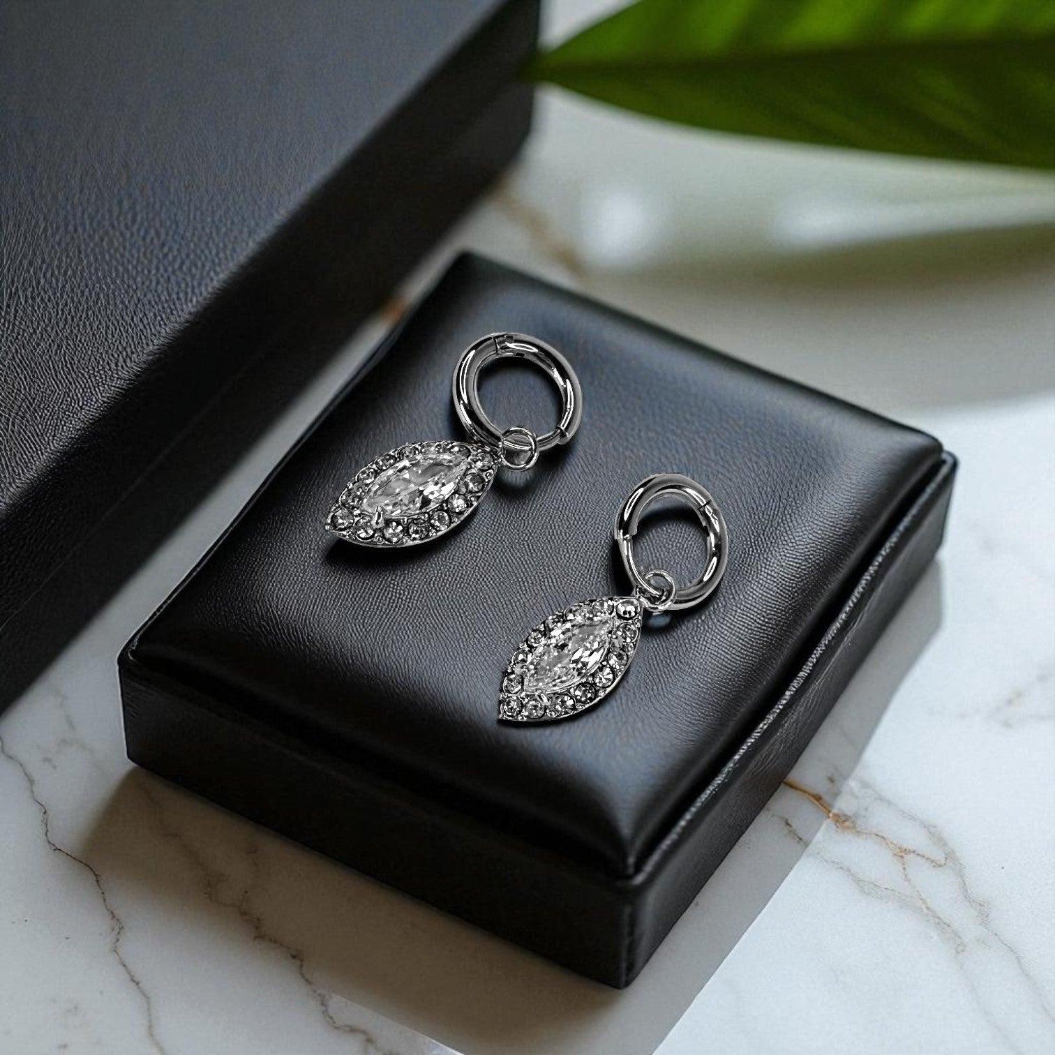 O Brinco Elara destaca-se pela sua zircónia lapidada em formato navette, contornada por pequenas pedras que intensificam o brilho com delicadeza. Uma peça que capta a luz com subtileza, ideal para quem valoriza o requinte nos detalhes e a elegância nos gestos.