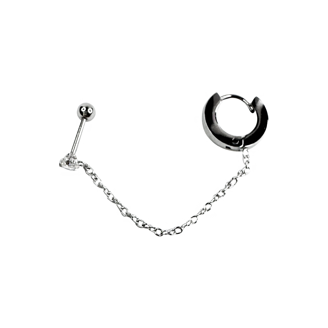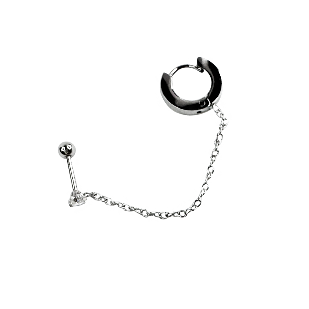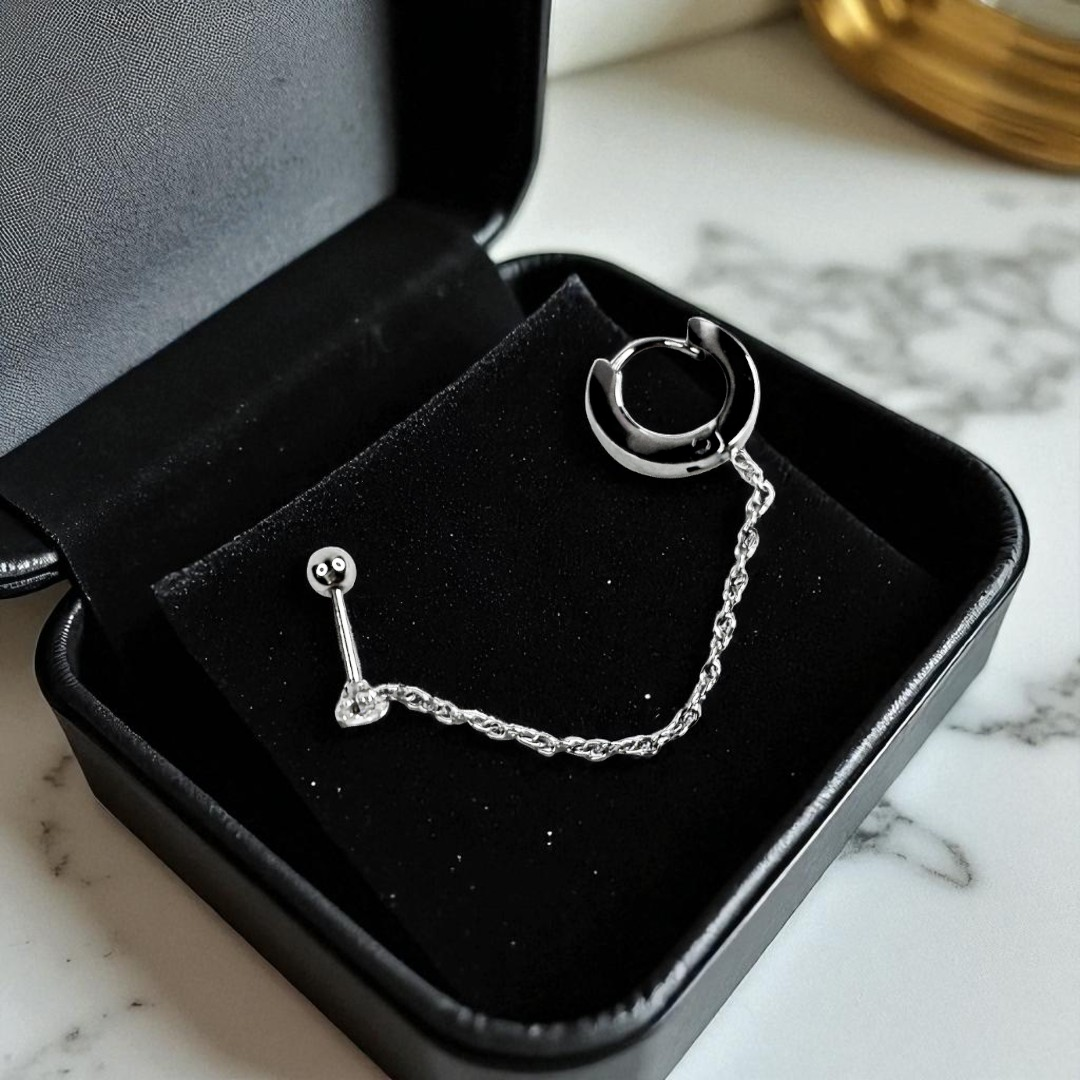 Um design ousado, com alma urbana e toque futurista. O Brinco Elara apresenta um piercing e um aro conectados por uma corrente delicada, criando um efeito visual de rebeldia elegante. A estrutura em metal prateado confere um acabamento espelhado que reflete a luz com intensidade, ideal para mulheres que gostam de marcar presença com originalidade e estilo. Para quem carrega atitude em cada detalhe.