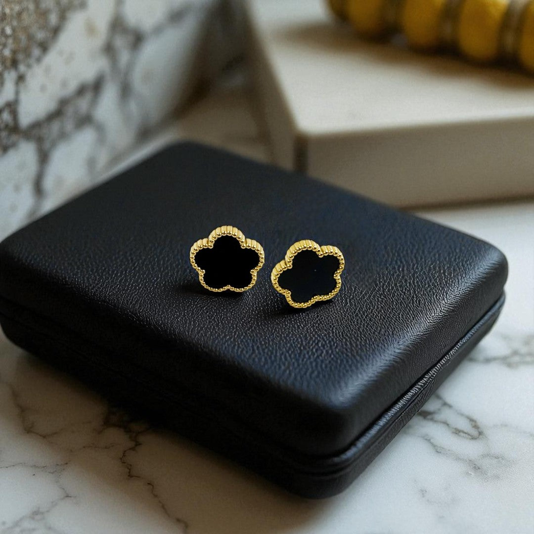 O Brinco Imperium Dourado destaca-se pelo formato floral sutil, com centro preto profundo emoldurado por um contorno em dourado texturizado — um equilíbrio entre o poder da elegância e o charme atemporal. Uma joia que fala sem palavras: transmite força, estilo e autoridade com delicadeza.