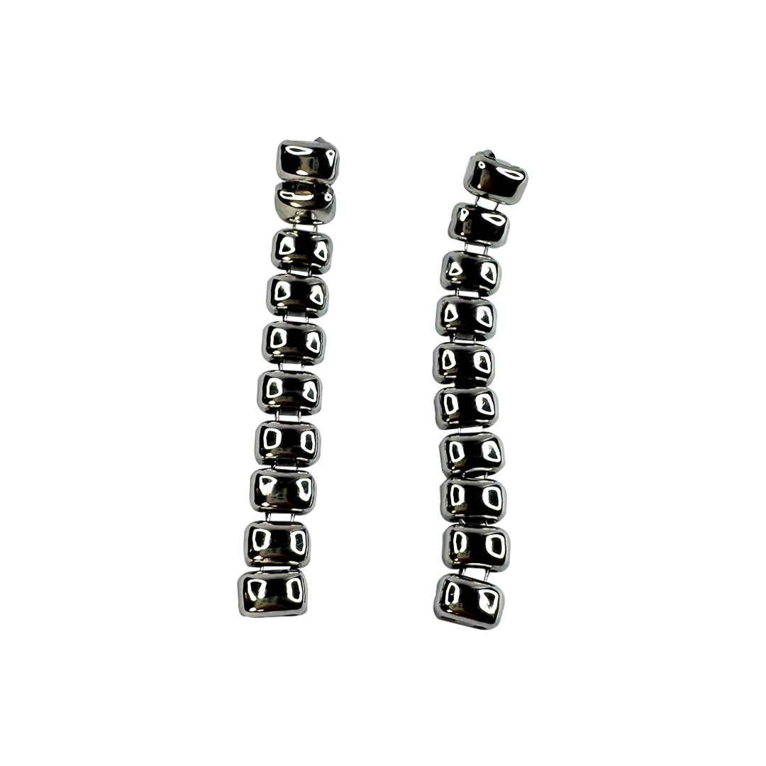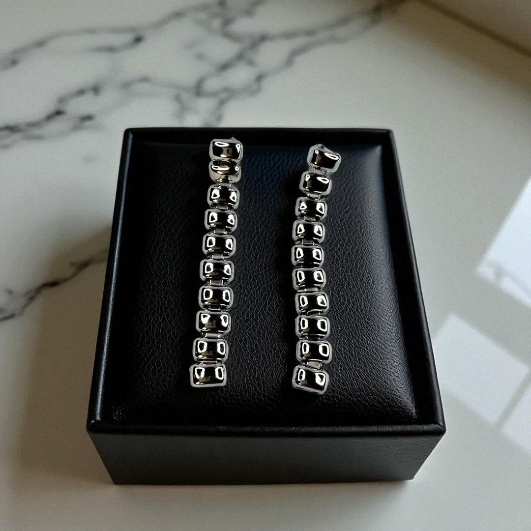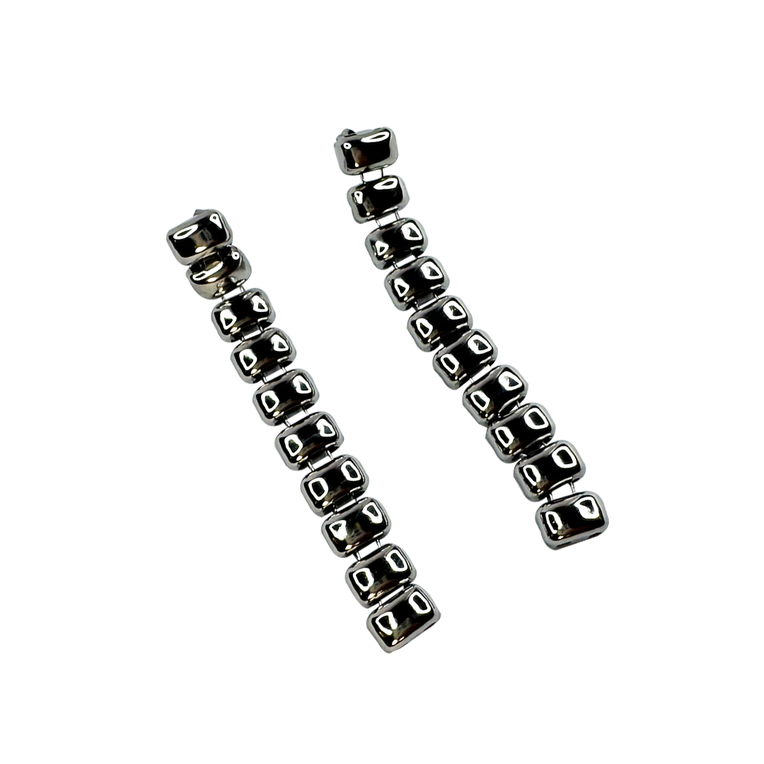 Com um design marcante e contemporâneo, o Brinco Nox exibe uma sequência harmoniosa de elos metálicos que criam um visual elegante e moderno. Sua estrutura linear alonga o rosto com sofisticação, enquanto o brilho prateado confere um toque de atitude e requinte.
