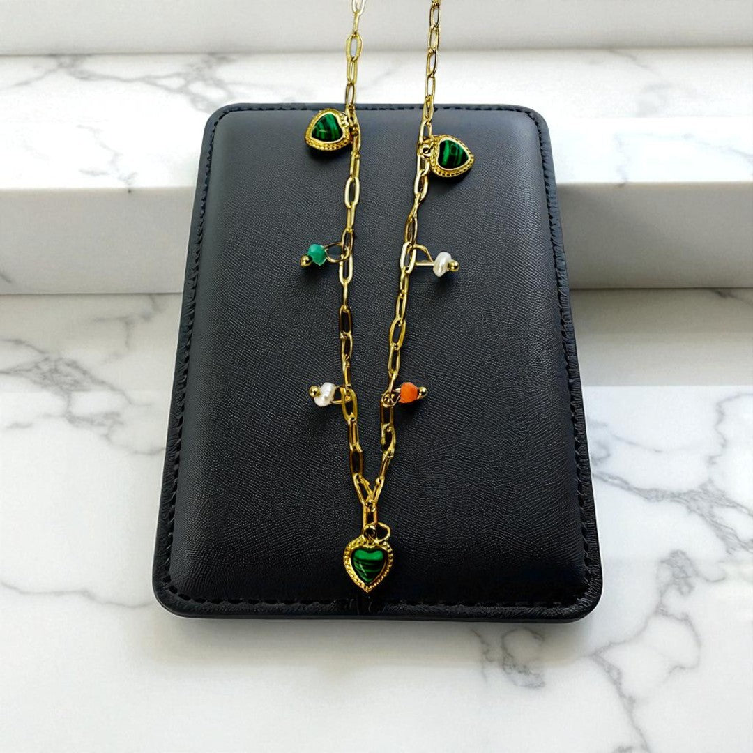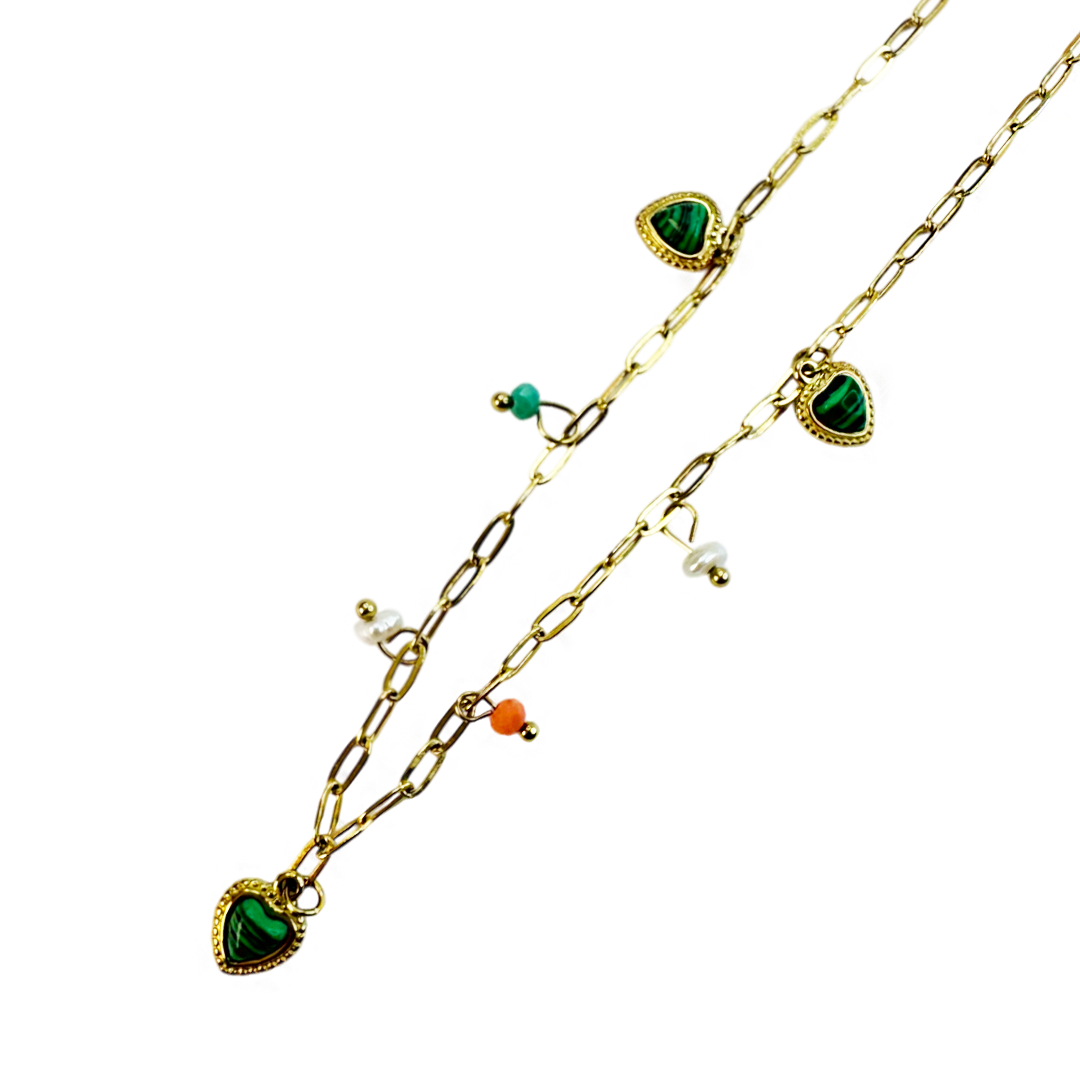 O Colar Élan destaca-se pelo seu design ousado e delicado ao mesmo tempo. Com pingentes coloridos em forma de coração e pedras peroladas estrategicamente posicionadas ao longo de uma corrente trabalhada, esta peça é a tradução perfeita de uma personalidade autêntica e luminosa.