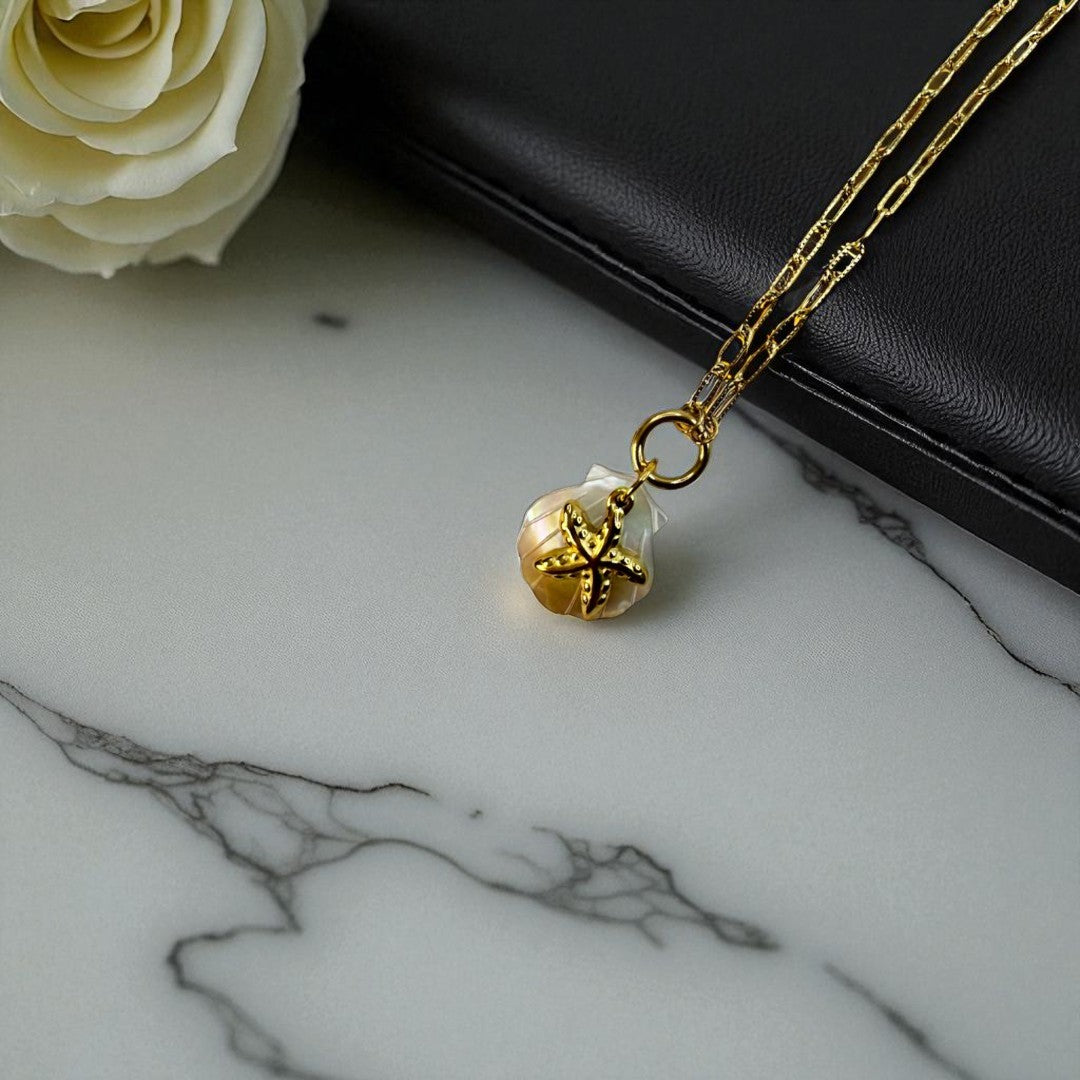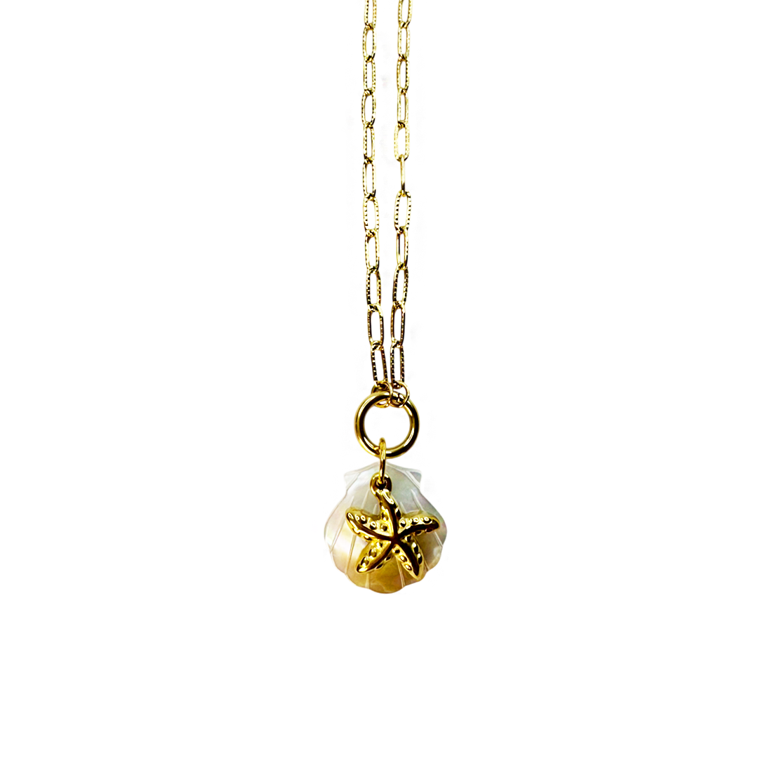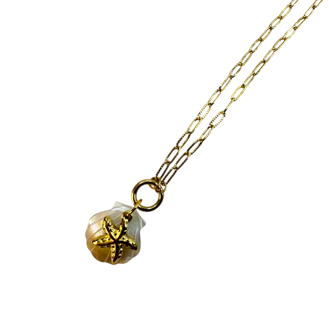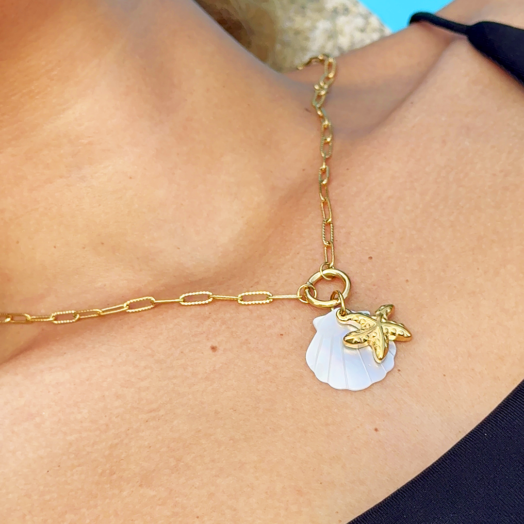 Delicado colar com pingentes de concha e estrela do mar em dourado, combinados com madrepérola branca. Uma peça que traz a leveza e frescor do verão, perfeita para looks casuais e momentos à beira-mar.