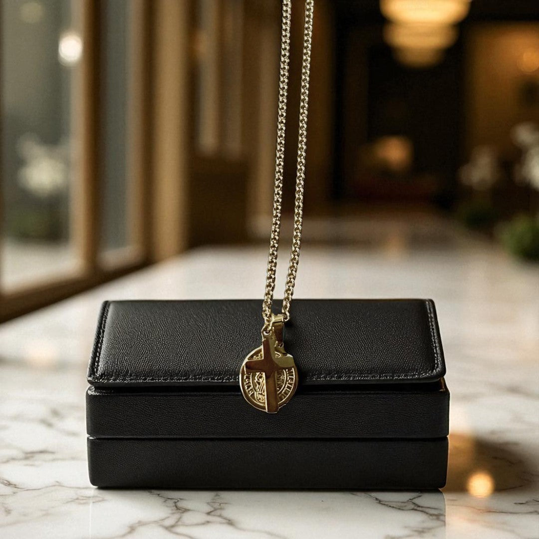 Uma joia que une fé e estilo com intensidade. O Colar Sanctus Dourado traz dois símbolos marcantes: a cruz e a medalha de São Bento, em um conjunto que transmite proteção, espiritualidade e identidade. Com acabamento polido e design clássico, é a escolha ideal para homens que carregam sua fé com orgulho e sofisticação.