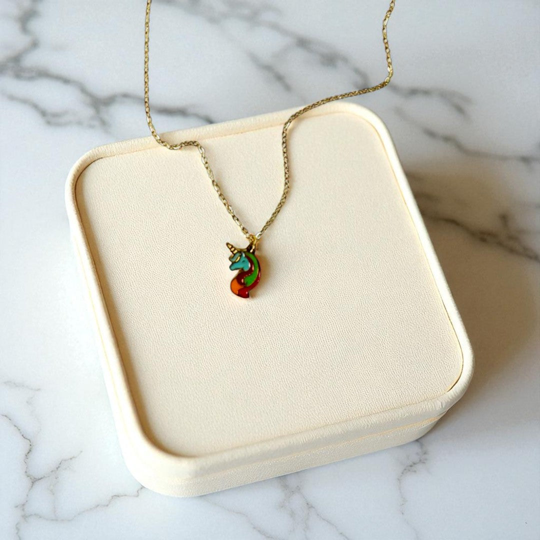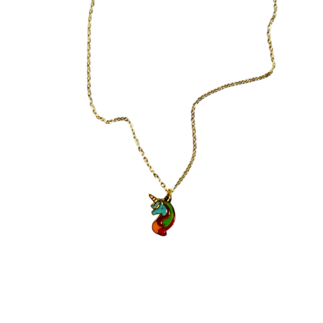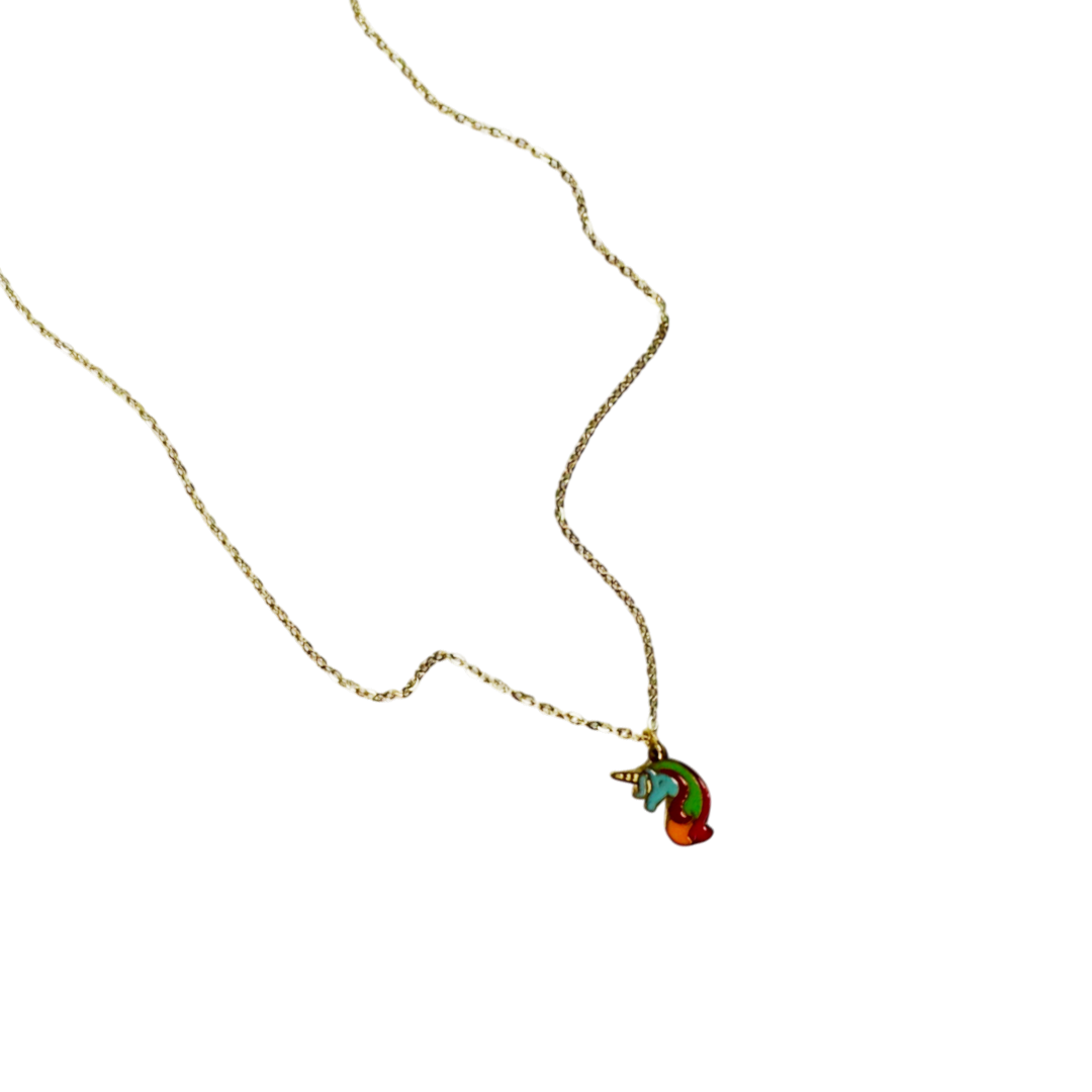 Deixe a imaginação voar com o Colar Sonho Colorido. Com corrente dourada delicada e pingente multicolorido em forma de unicórnio, esta peça traz a fantasia para o dia a dia das crianças — um acessório alegre e cheio de personalidade que vai encantar em cada detalhe.