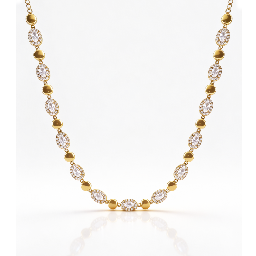 O Conjunto Amarisse Dourado é pura celebração da luz e da harmonia — composto por colar longo e pulseira com elos circulares e ovais cravejados de zircónias, cada peça transmite uma sofisticação atemporal. O dourado radiante envolve o brilho das pedras, criando uma estética luxuosa e imponente, ideal para mulheres que expressam a sua elegância com brilho e personalidade.