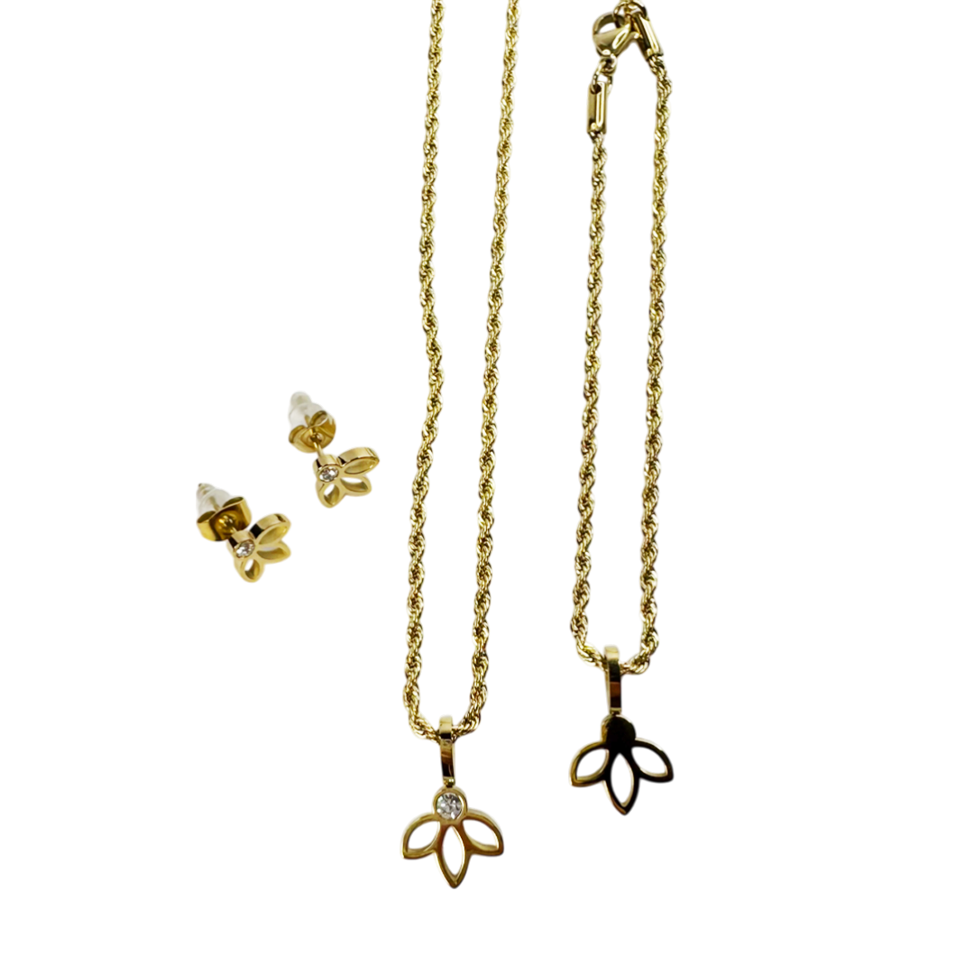 Com acabamento polido e dourado reluzente, este conjunto é a escolha perfeita para mulheres que apreciam joias com significado, leveza e presença. Ideal para ocasiões especiais ou para trazer charme aos momentos do dia a dia.