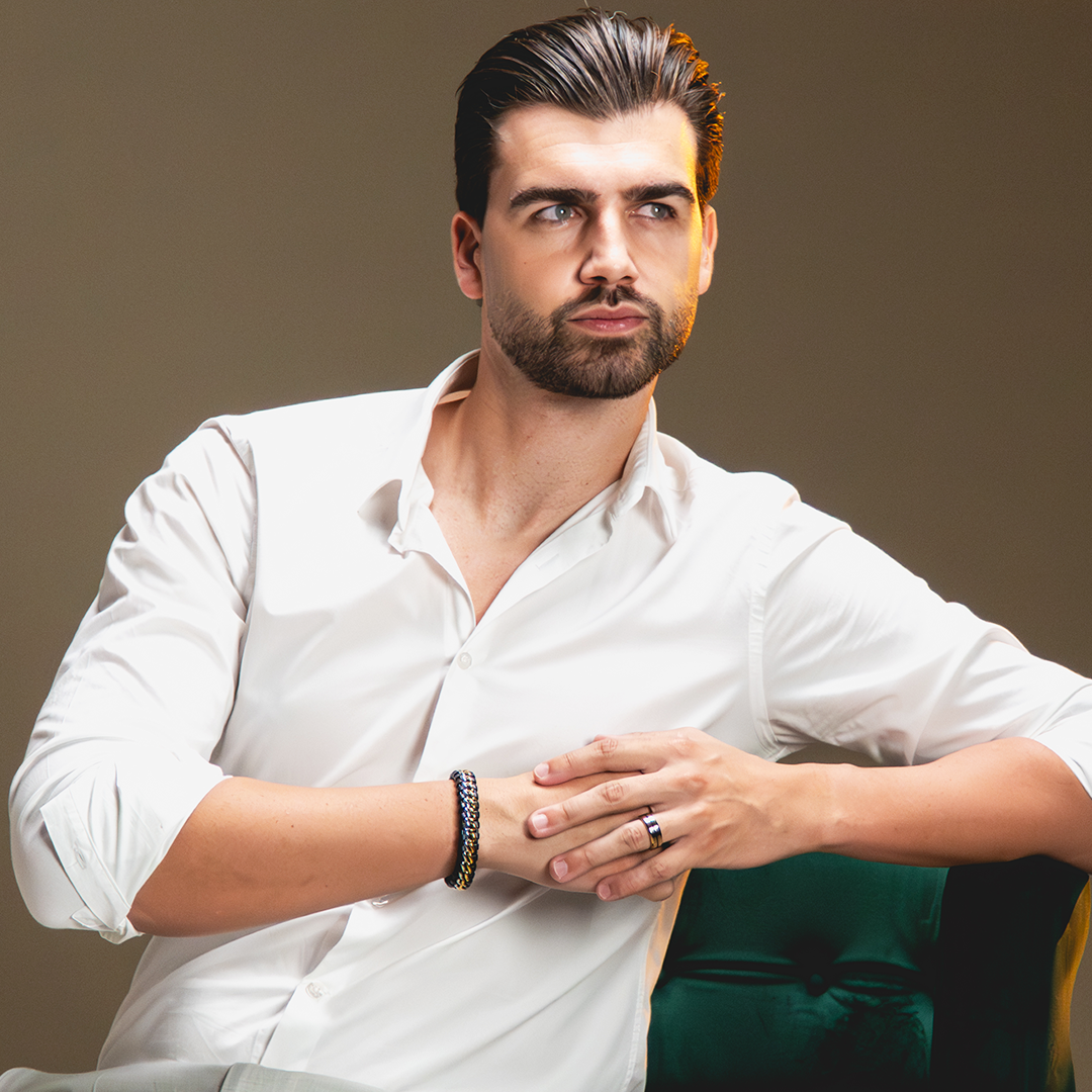A Pulseira Alpha é a peça definitiva para quem domina o estilo. Sua complexa trama de couro preto entrelaçada com metais prateados e dourados simboliza a capacidade de integrar diferentes forças e liderar com versatilidade. O Alpha Bicolor é a sua assinatura de comando, mostrando que você não se limita a uma única cor, mas sim orquestra o visual com elegância e estratégia.