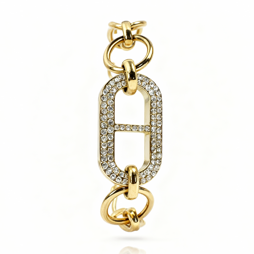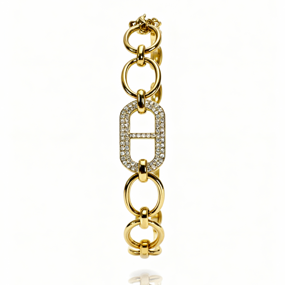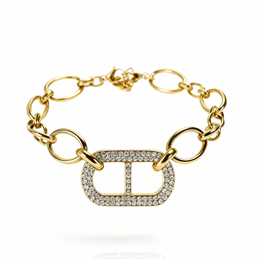 A Pulseira Matrona é a sua peça de poder e luxo contemporâneo. Esta corrente é composta por elos ovais polidos que conduzem o olhar ao seu elo central cravejado, que irradia um brilho total e intenso. O design arrojado, que remete à nobreza e ao matriarcado, torna-a um statement de distinção imediata.