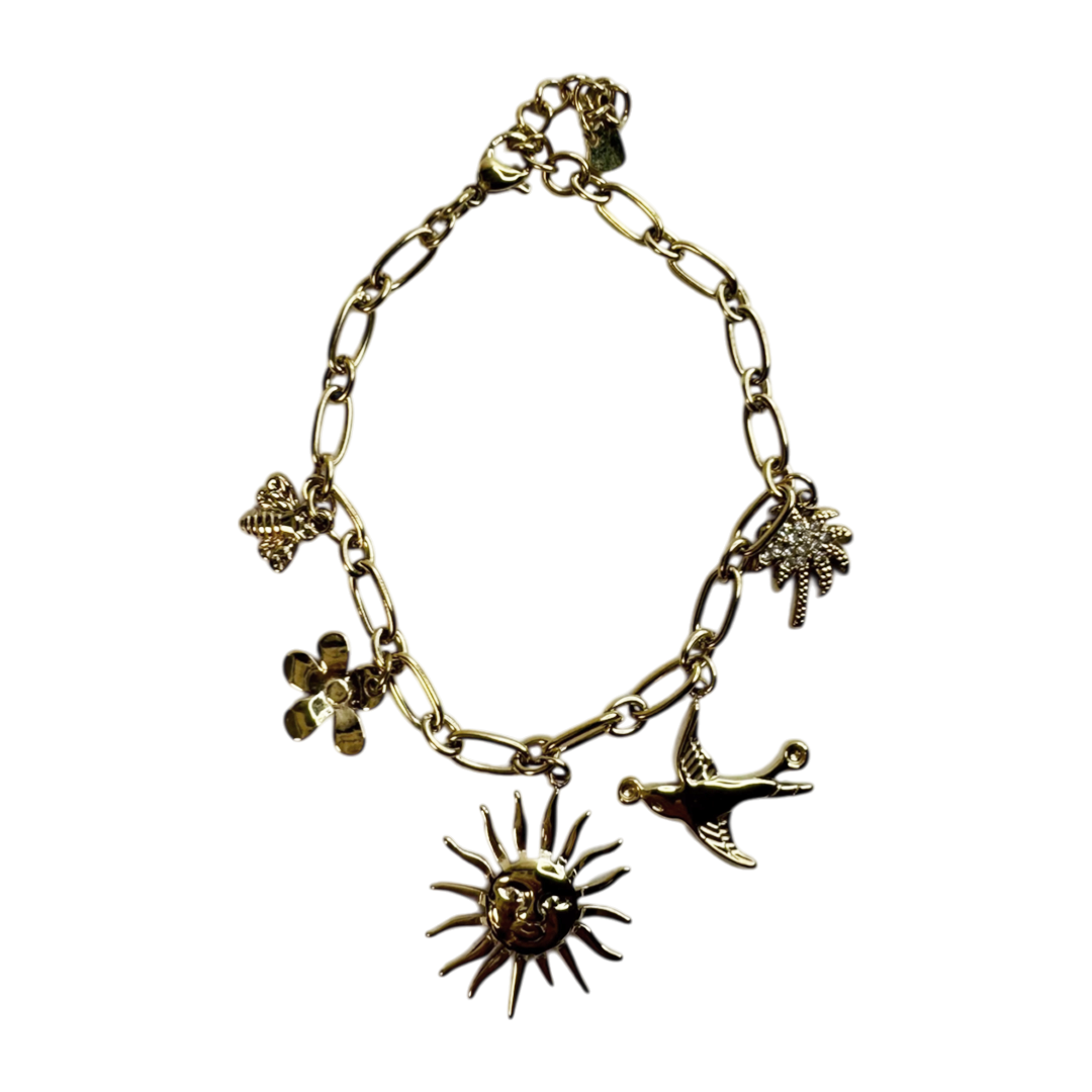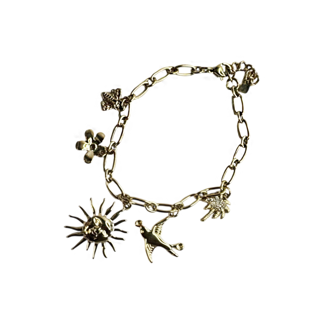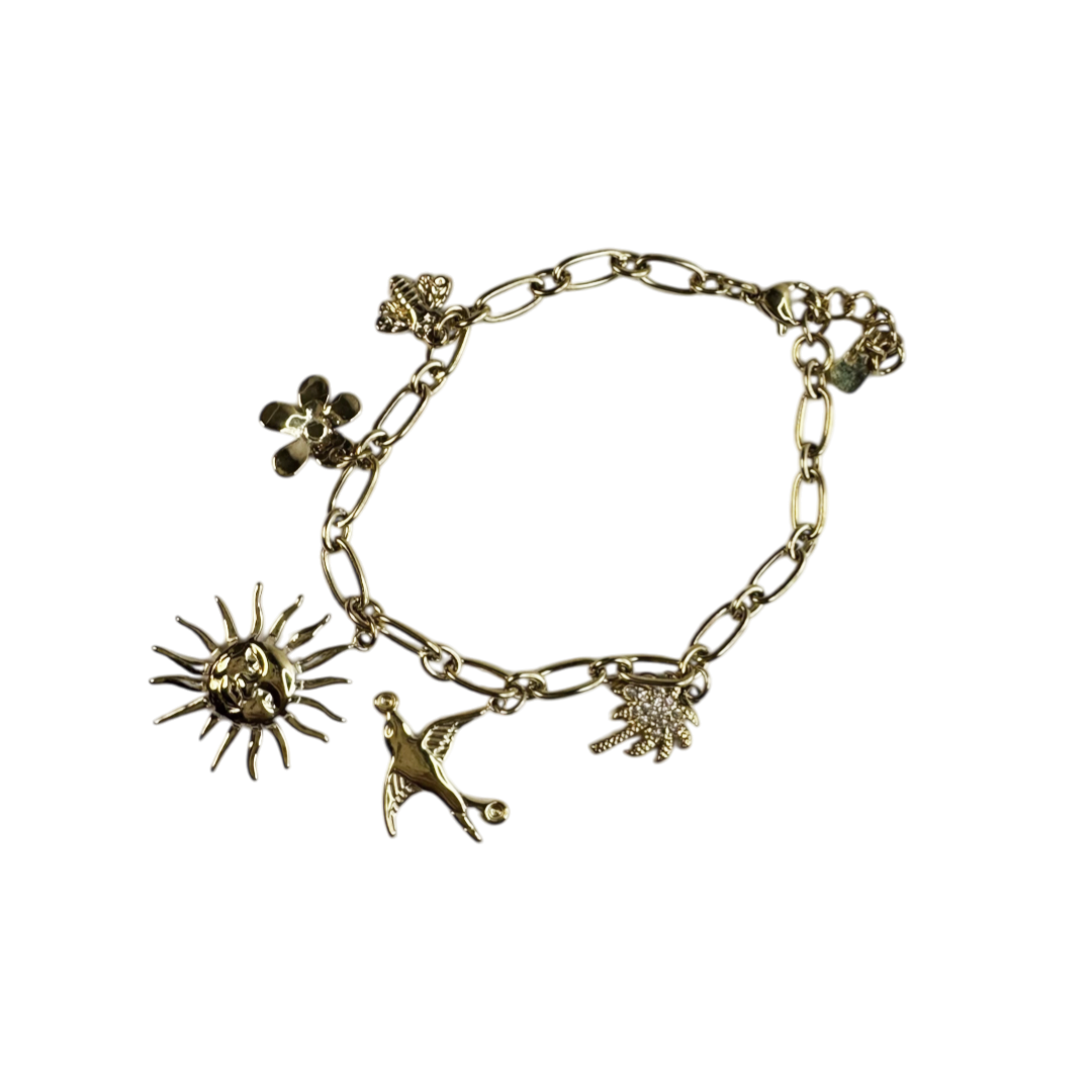 A Pulseira Solara é uma celebração ao calor dos dias tropicais e à liberdade que só o verão sabe traduzir. Os pendentes cuidadosamente selecionados — entre flores, palmeiras, aves e um imponente sol central — evocam memórias de praias douradas e viagens inesquecíveis.