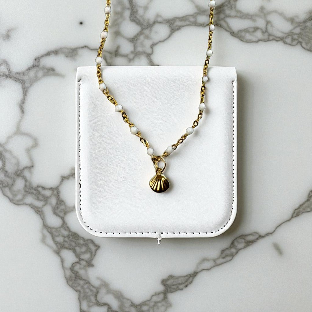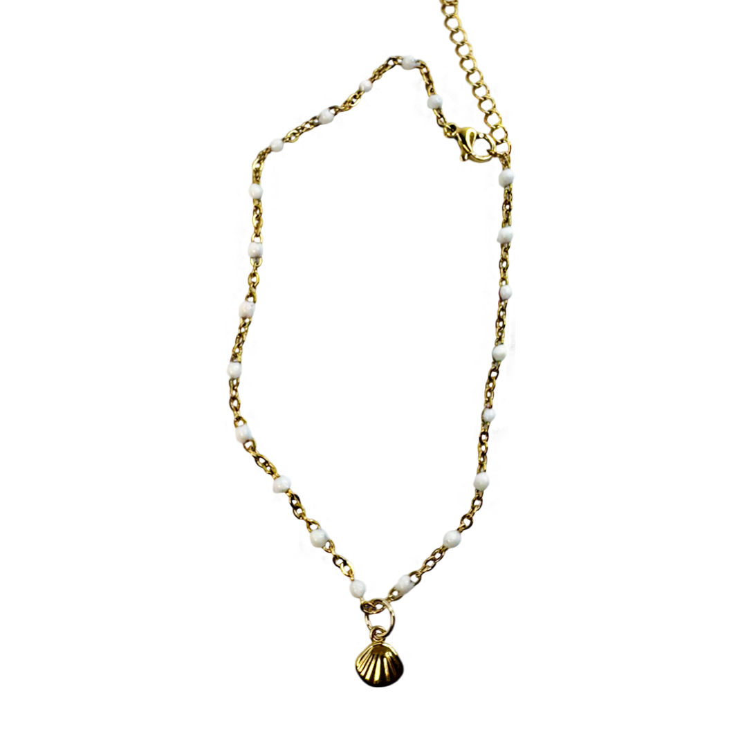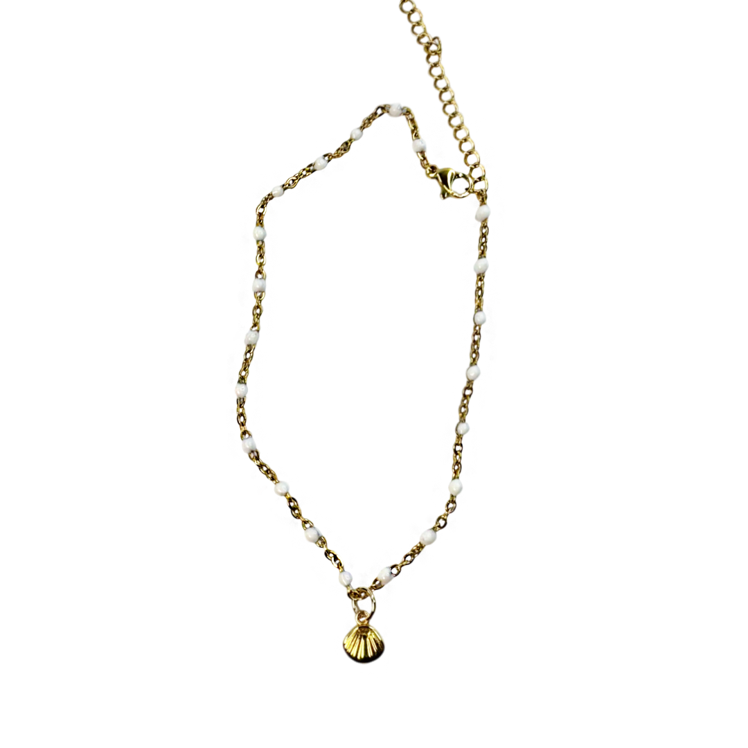 A Tornozeleira Aluna é uma celebração da leveza e da conexão com o mar. Com contas brancas espaçadas sobre corrente dourada e um delicado pendente de concha, esta peça traz um toque de frescor e feminilidade a qualquer composição.