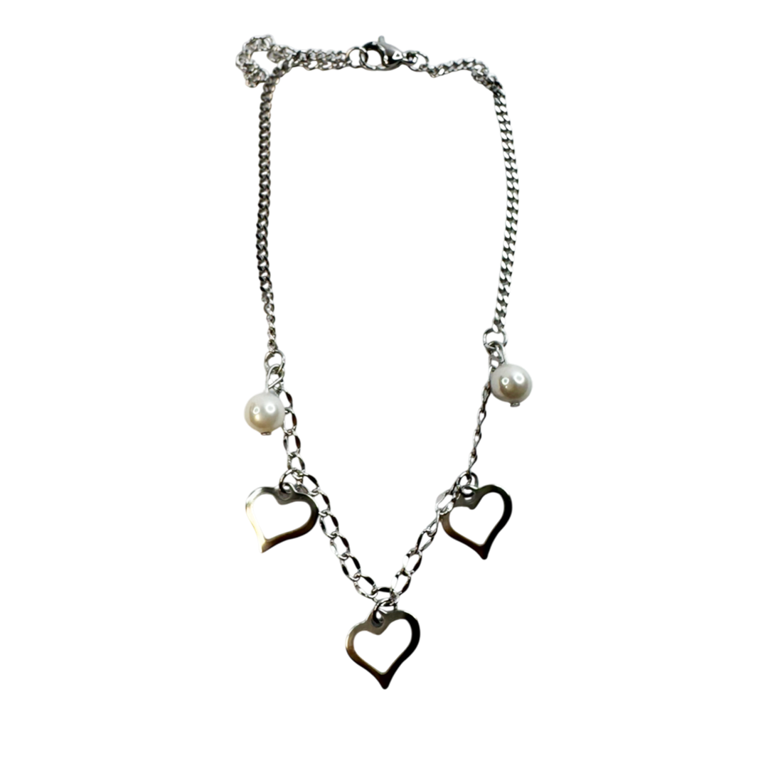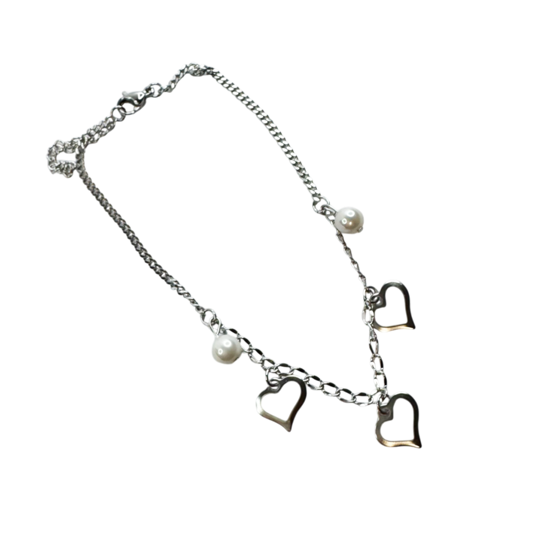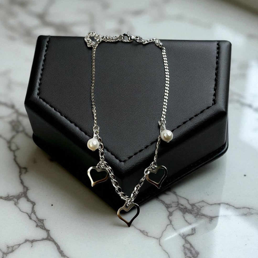 Com um toque de romance moderno, a Tornozeleira Avelle combina o brilho delicado das pérolas com o simbolismo dos corações vazados, criando uma peça leve, encantadora e cheia de personalidade.