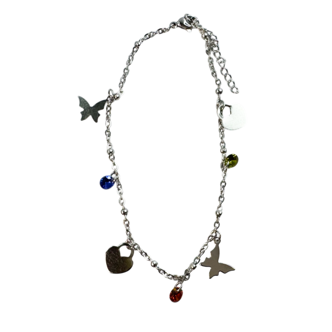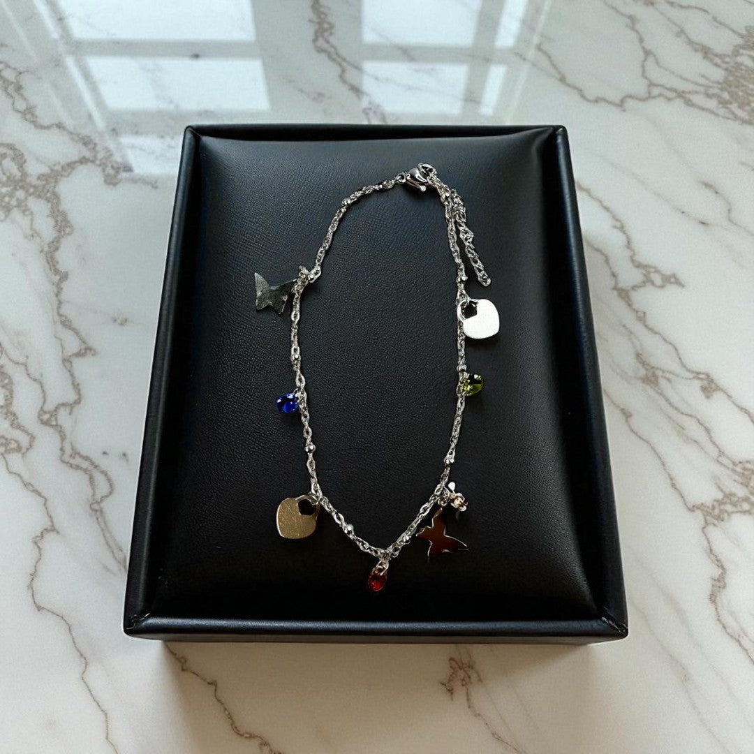 A Tornozeleira Elenya celebra o encanto dos pequenos detalhes. Com pingentes delicados em forma de estrela, coração, borboleta e contas coloridas, esta peça transmite leveza, imaginação e liberdade num só olhar. A corrente prateada fina acrescenta elegância ao estilo descontraído da composição, tornando-a ideal para mulheres que gostam de expressar a sua essência com autenticidade e doçura.