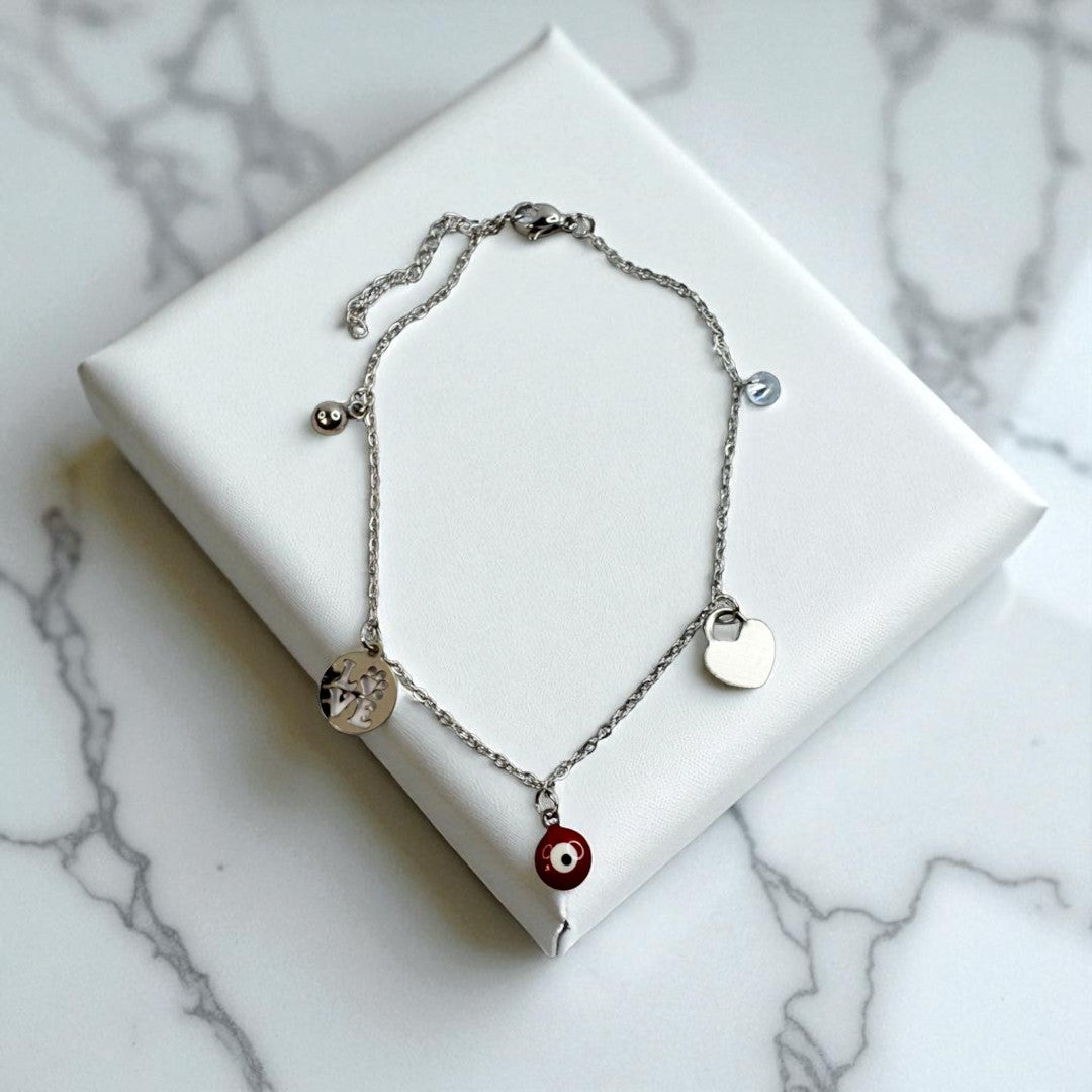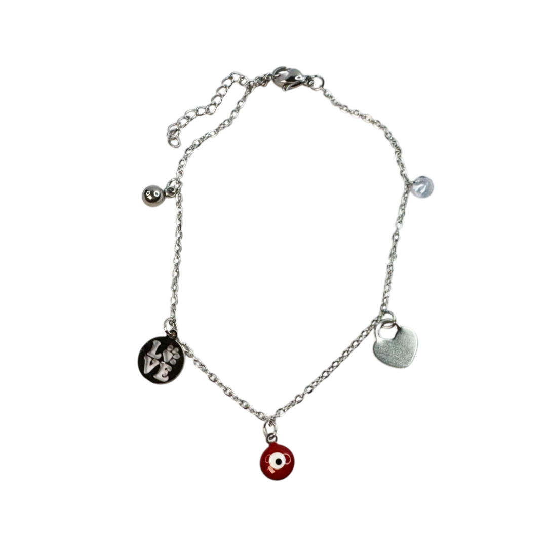 Despojada e cheia de atitude, a Tornozeleira Mood mistura símbolos afetivos e contemporâneos — como o coração, a palavra "LOVE", o olho grego e elementos lúdicos — para criar uma peça com identidade própria. Com design leve e marcante, é perfeita para compor visuais casuais com um toque urbano e irreverente. Ideal para mulheres que expressam emoções com estilo e se conectam a joias com significado.